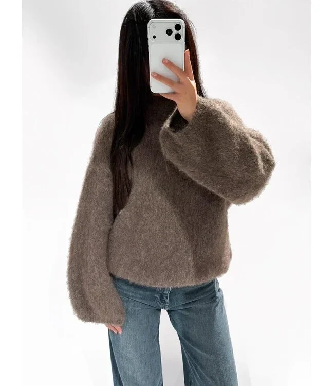 Deze taupe kleurige oversized fluffy trui is dé perfecte combinatie van comfort en stijl. De trui heeft een losse pasvorm en zachte, pluizige textuur die direct een cozy look creëert. Dankzij de ballonmouwen en de subtiele ronde halslijn krijgt de trui een moderne, vrouwelijke uitstraling. Ideaal voor een casual outfit, zowel thuis als onderweg.